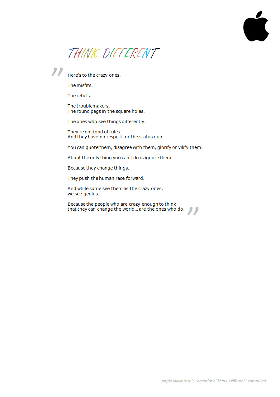 Apple stod på konkursens rand mot slutet av 1990-talet. Men 1997 lanserades reklamkampanjen Think Different, som tillsammans med Steve Jobs återinträde var en nystart som skulle utvecklas till den troligen största företagsvändningen i historien. _Think Differen_t och självklart Steve Jobs bidrog starkt till den vansinnigt starka, kreativa och nytänkande kultur som omgärdar Apple idag. Kulturen har visat sig svårslagen och jag rekommenderar er starkt att se reklamfilmenoch skriptet ser du här (MIT-B).